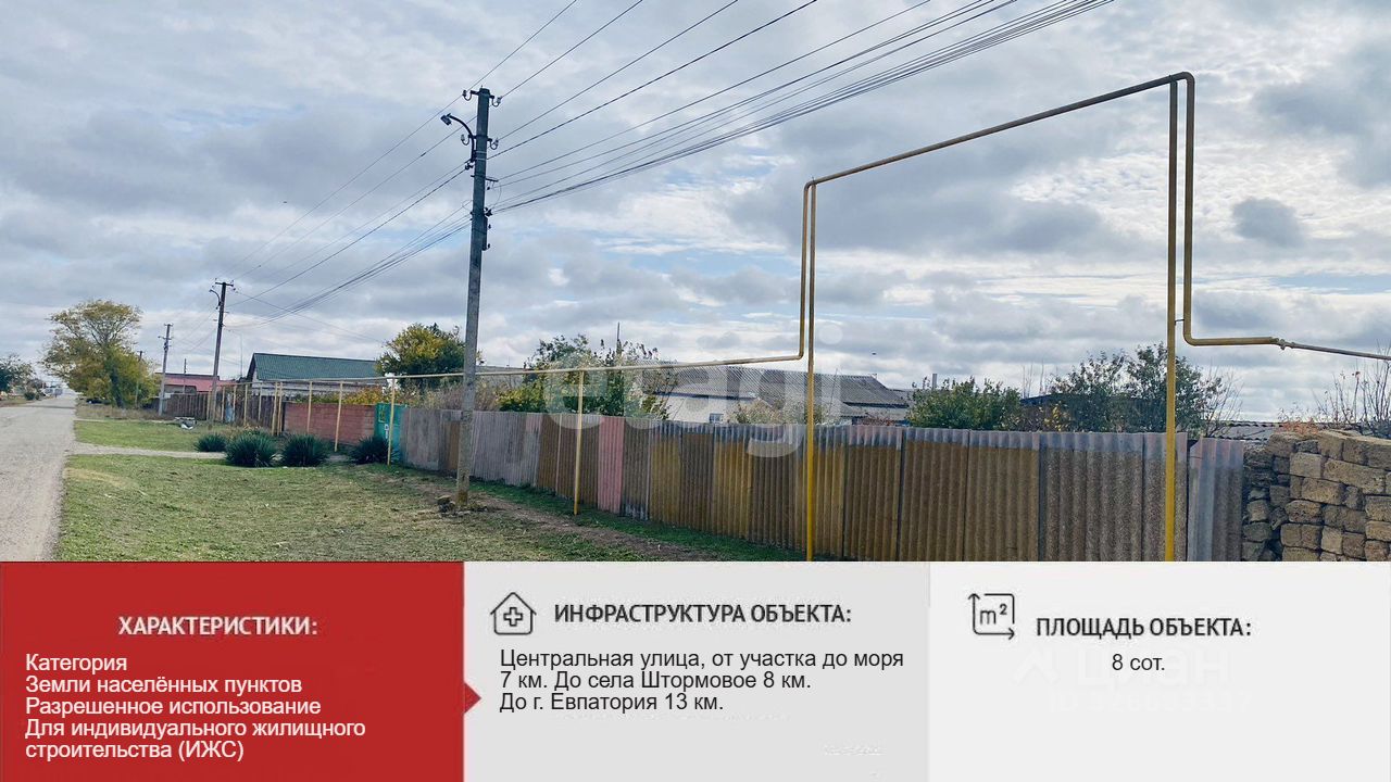 Центральная улица, от участка до моря 7 км. До села Штормовое 8 км. До г. Евпатория 13 км.