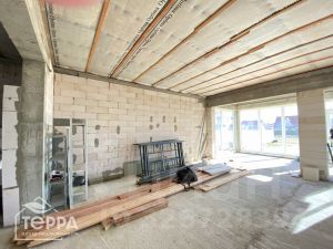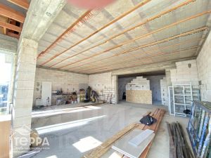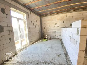 Готовый каркас: парадный вход с витражными окнами, большая гостиная-столовая, кухня и санузел.