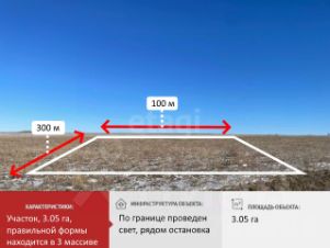 Представляет собой участок общей площадью 3.05 га. Участок имеет ровный рельеф. Отличное месторасположение, экологически чистый район.