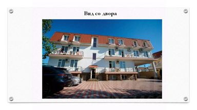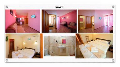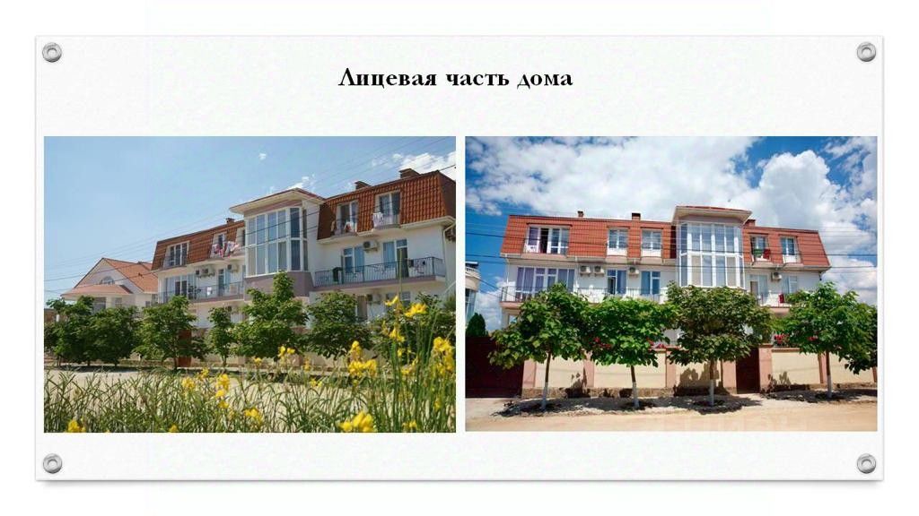 Дом находиться в курортной зоне города Евпатория, в ПГТ Заозерное, на берегу моря ( 500 метров до песчаного пляжа) в экологически чистом месте Крыма. Здание построено по индивидуальному проекту и представляет собой железобетонный каркас с наружными стенами из камня ракушечника. Коммуникации : центральная вода, канализация, газ, электричество 380 вольт. на территории есть колодец. Индивидуальное отопление от газового котла фирмы OERTLI, резервный котел- электрический. Горячее водоснабжение осуществляется от котла и с использованием гелиосистемы (на крыши дома размещены гелиоколлекторы фирмы SIN SOLAR CS- V3R- 26 штук) В топочной установлены емкости для горячей воды и резервные для холодной воды. обеззараживание воды осуществляется двумя ультрафиолетовыми лампами. в доме 30 комнат. В каждой комнате есть балкон, санузел, телевизор, кондиционер, холодильник, интернет. В цокольном этаже расположена сауна с бассейном, а также кухня, зал для приема пищи, прачечная , топочная, служебные помещения. Територия благоустроенная с большой зеленой зоной, имеется беседка с мангальной зоной, детская площадка, стоянка для машин. Также дом можно использовать как гостиницу.