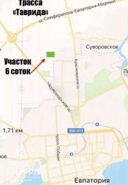Рядом асфальтированная дорога, обжитой микрорайон Исмаил-Бей, а с другой стороны съезд на трассу "Таврида". Всего в 10 минутах от города — и вы уже в Евпатории. 15 минут на авто до моря.