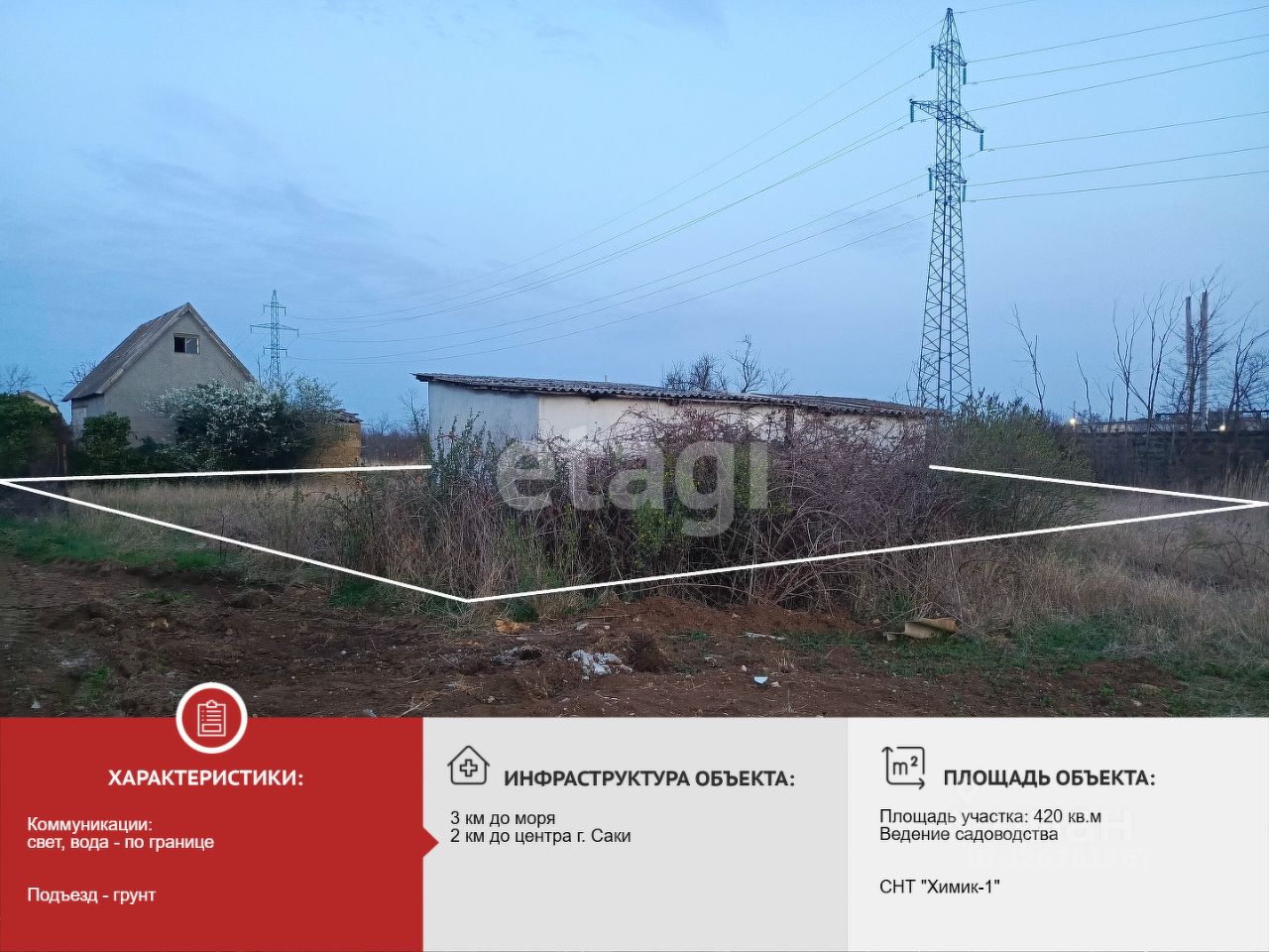 Расположен участок в СНТ "Химик-1" в близости к трассе Евпатория-Саки. Участок ровный, прямоугольный