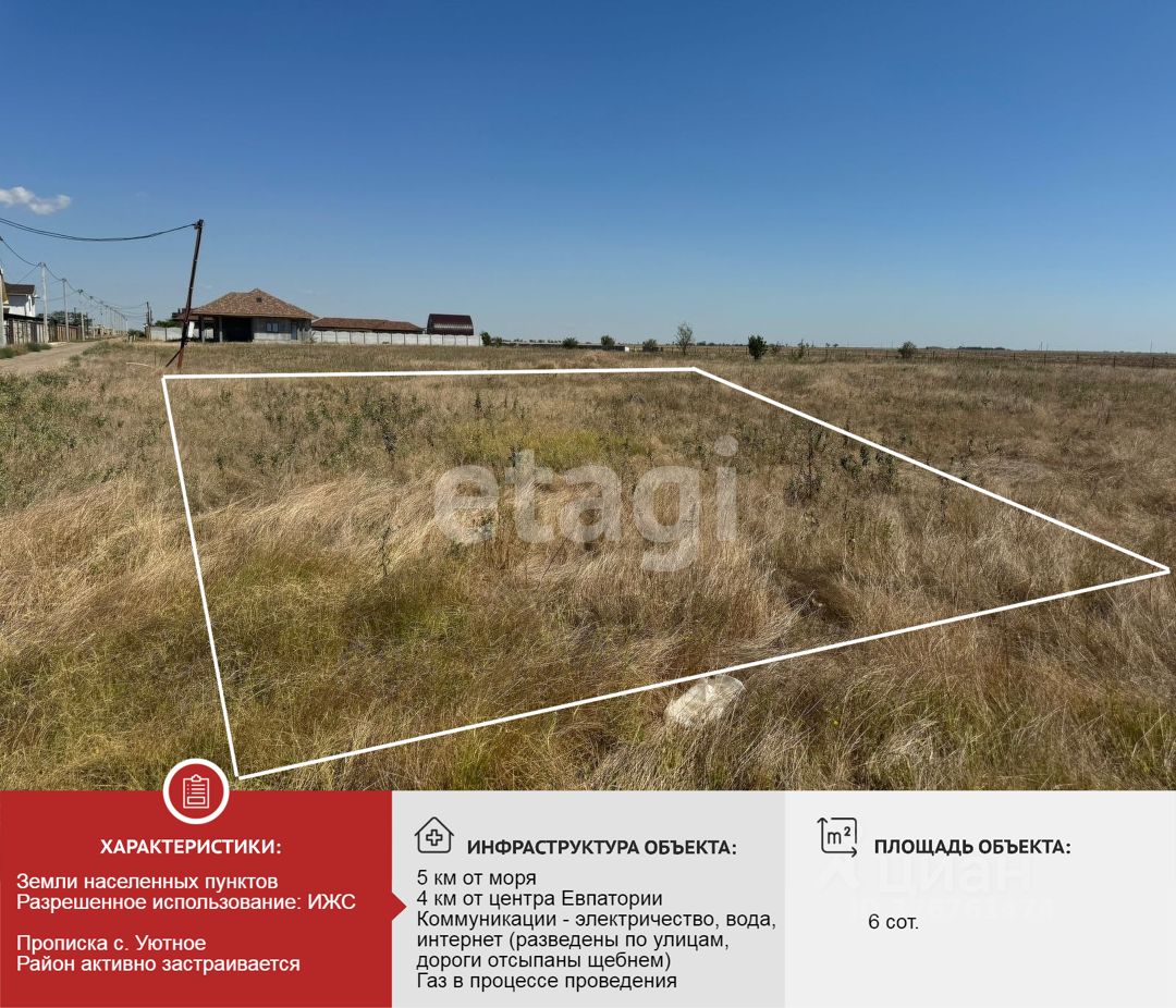Участок расположен в активно застраиваемом массиве всего в 3 км от Евпатории. Вид разрешённого использования — индивидуальное жилищное строительство, что позволяет возвести капитальный дом с постоянной пропиской. Участок правильной прямоугольной формы. Полный пакет документов РФ готов: утверждён проект планировки территории (ППТ), выписки из ЕГРН на руках.