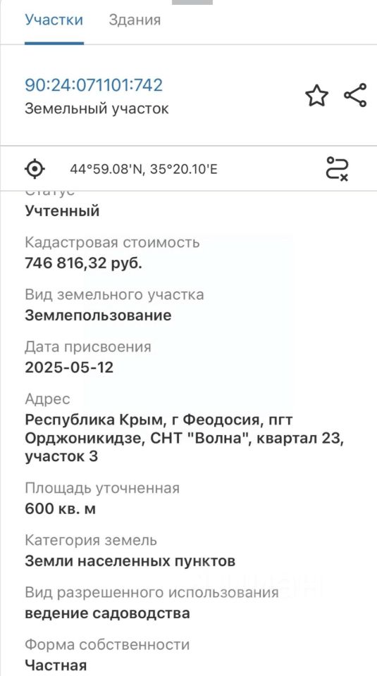 Продается земельный участок в г. Феодосия,пгт Орджоникидзе, СНТ "Волна" квартал 23 участок 3 в дачном кооперативе!Предлагаем вашему вниманию отличный земельный участок в живописном районе Феодосии, в дачном кооперативе "Волна". Это идеальное место для строительства вашего уютного дома или дачи у Черного моря!Основные преимущества участка:1.Площадь: 600 кв.м 20 на 30м2.Назначение: Подходит для строительства жилого дома, дачи или коттеджа. Разрешено возведение капитальных построек (жилых домов) с возможностью прописки.3.Расположение: Участок находится в экологически чистом районе Феодосии,пгт Орджоникидзе в дачном кооперативе с развитой инфраструктурой.4.Близость к морю: До берега Черного моря и оборудованных песчаных пляжей всего 1 км! Это 5-10 минут на машине или комфортная прогулка на велосипеде.5.Инфраструктура: Вблизи есть все необходимое магазины, кафе, остановки общественного транспорта. Удобный подъезд к участку.6.Природа и климат: Феодосия славится мягким климатом, чистым воздухом и живописными видами, что делает это место идеальным для отдыха и постоянного проживания.Дополнительные плюсы:1.Участок ровный, готов к застройке.2.Подведены коммуникации для подключения воды и света.3.Спокойная и дружелюбная атмосфера дачного кооператива.4.Близость к достопримечательностям Феодосии: музеи, набережная, исторические места.Почему стоит купить Этот участок отличная инвестиция для тех, кто мечтает о собственном доме у моря или хочет создать место для семейного отдыха. Феодосия это город с богатой историей, прекрасными великолепными пляжами и оживленный туристический сезон делают его идеальным местом для инвестиций в недвижимость.Не упустите шанс стать владельцем участка в одном из самых красивых уголков Крыма! Звоните, чтобы узнать подробности и договориться о просмотре! Размер участка составляет 30 на 20 метров, а расстояние до моря — 1500 метров.