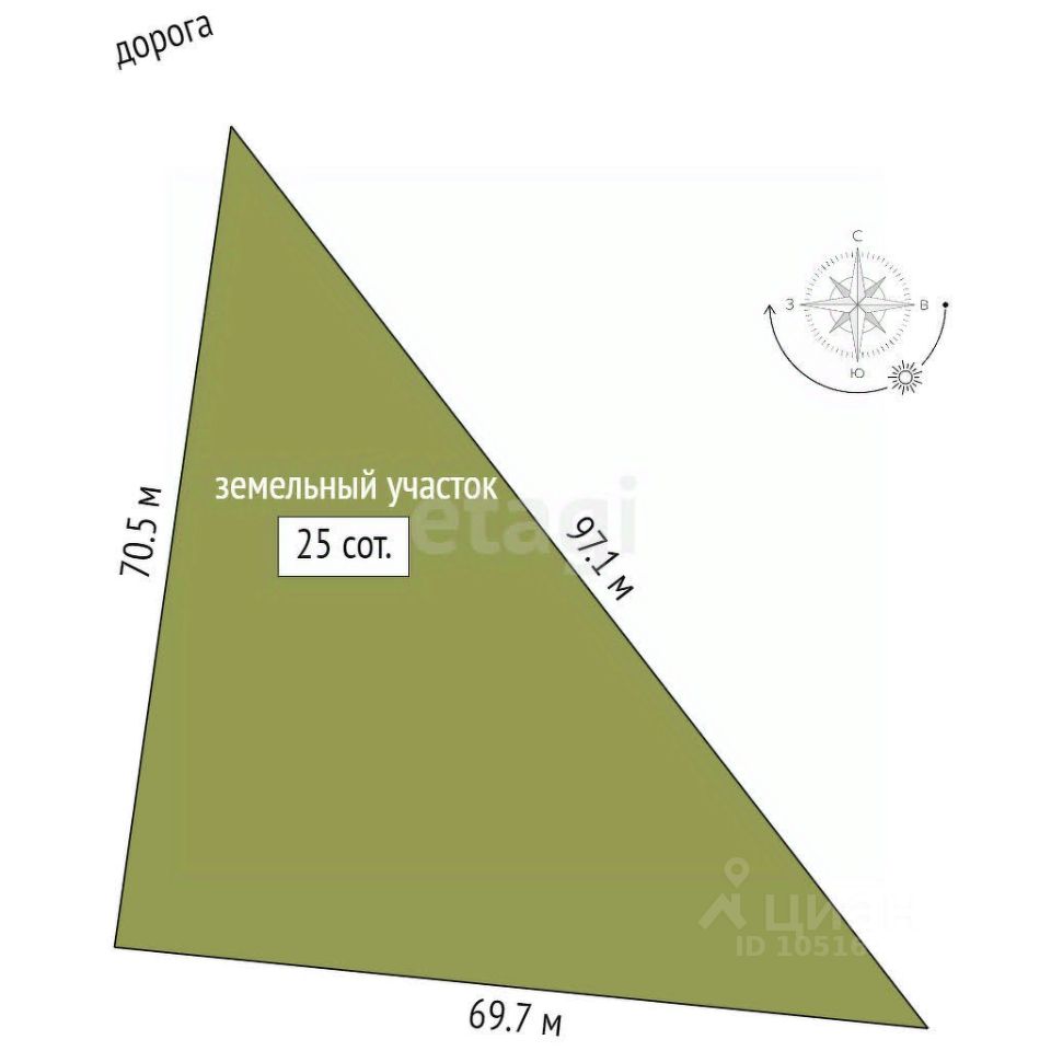 Участок имеет ровную треугольную форму и хорошие подъездные пути.