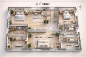 • 2-й этаж: санузел, две детские комнаты, просторная мастер-спальня с большим гардеробом и собственным санузлом