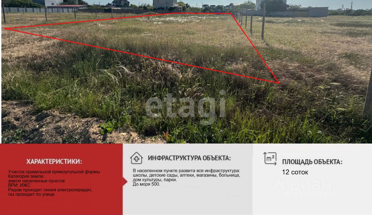 До моря и песчаного пляжа 500м. Участок правильной прямоугольной формы, не огорожен по периметру. Есть возможность подключения к электричеству, газу и центральному водоснабжению.