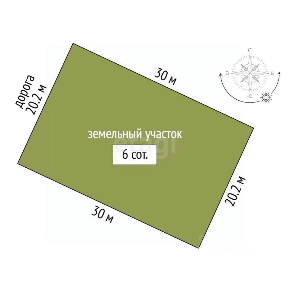 Общая площадь - 6 соток. Это ровный и сухой земельный участок, ровный прямоугольник 30*20м.