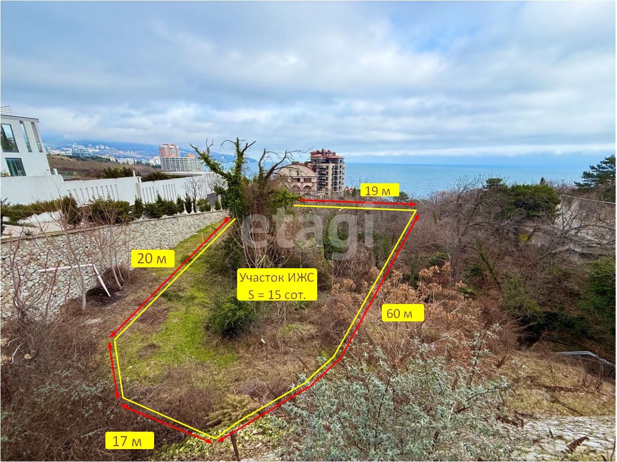 Продается видовой участок общей площадью 15 соток ( по документам два смежных участка 8 сот. и 7 сот.) в царской Ливадии (низ), назначение ИЖС.