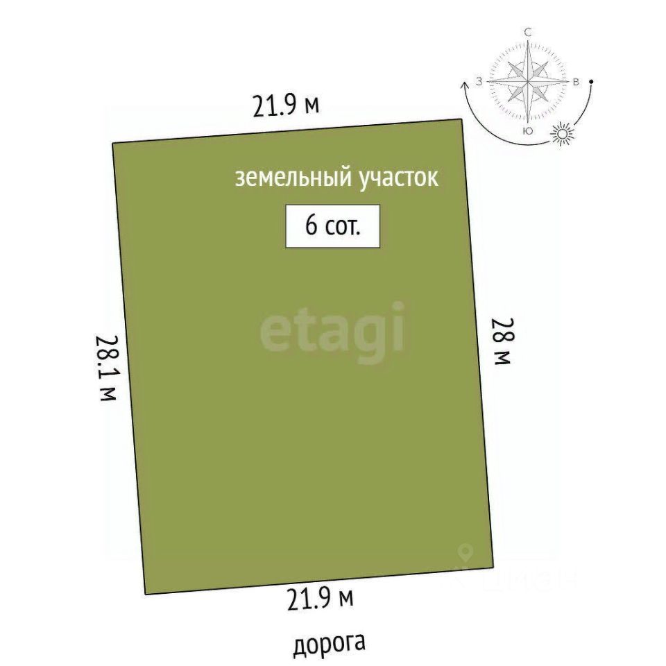 Общая площадь - 6 соток. Это ровный и сухой земельный участок, ровной прямоугольной формы.