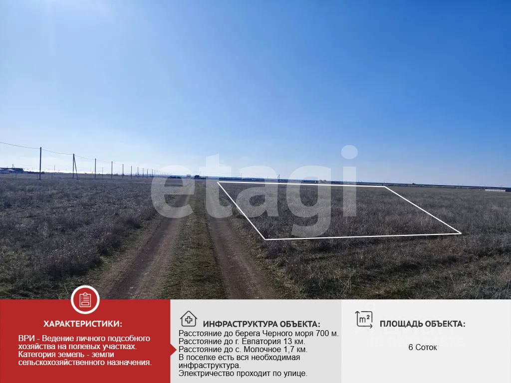 Продам видовой земельный участок площадью 6 соток в 700 метрах от берега Черного моря, в 1,7 километрах от курортного поселка Молочное. В 13 километрах от центра города Евпатория.
