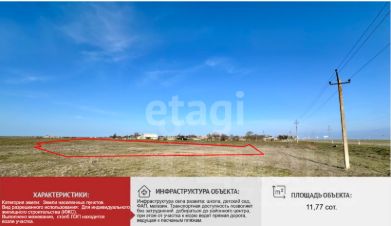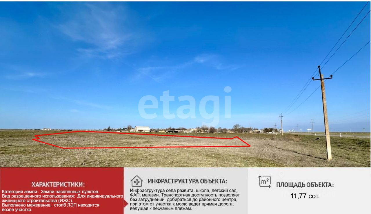 В селе развитая инфраструктура: школа, детский сад, магазины, aмбулaтоpия, ФАП, выезд на траccу. По прямой до морского побережья - 3 км, если по дороге - 7 км. Чистейший пляж. Участок, идеально подходит для строительства дома вашей мечты, находится всего в 4 км от уединенного пляжа и в 7 км от Бакальской косы, где вас ждет уникальное сочетание Черного моря и Каркинитского залива!