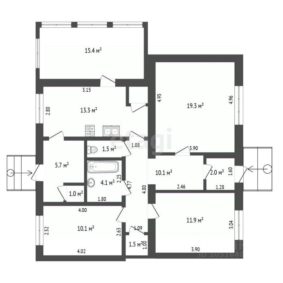Количество комнат: 4 (3 закрытые, 1 проходная, также есть 1 комната с отдельным входом)