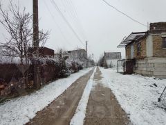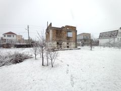 На участке есть недостроенный 2-хэтажный дом. Коробка 6 м х 6м., с крышей. 1-й этаж - гараж и подвальное помещение, второй этаж - комнаты и кухня. Окна застеклены, крыша перекрыта. Дом построен из крымского ракушечника и блоков.