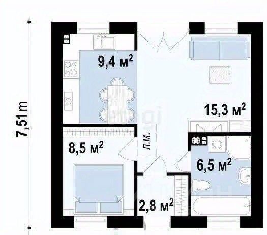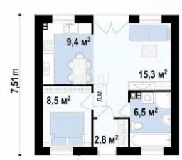 Две спальни 15,3 м2 и 8,5 м2, кухня-гостиная 9,4 м2, сан.узел 6,5 м2