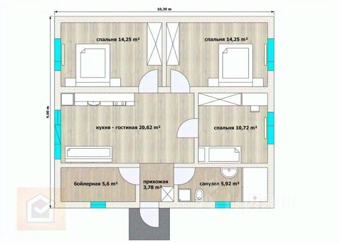 Арт. 92191796. Площадь строения по фундаменту: 92,7 м² Жилая площадь дома: 75,05 м² Характеристики: Размеры дома по фундаменту: 10,3*9м 3 спальни, Кухня-гостиная, Санузел, Бойлерная, Коридор, Прихожая Фундамент: бетон м250 Материал стен: газоблок или ракушка* Колонны, армопояс,перемычки: бетон м250 Кровля: балки и стропила 150*50мм, металлочерепица 0,45мм, утеплитель 150 мм минвата Внешняя отделка: утеплитель пенопласт 5 см, штукатурка "короед", покраска Предчистовая отделка от 6 052 800 рублей Возможно строительство в ипотеку и за наличный расчет. Данная комплектация дома подходит под семейную ипотеку Срок строительства 3-4 месяца. Выполняемые работы земляные работы (разработка участка под фундамент) монтаж фундамента подушки, ленты с армировкой (бетон м250) монтаж канализации монтаж монолитной плиты с армировкой возведение наружных стен и перегородок (газоблок D500) устройство перемычек окон и дверей (бетон м250) устройство колон и армирующего пояса (бетон м250) устройство кровли и дымохода (мет черепица) водостоки (по четырем углам) утепление потолка (мин вата 150 мм) окна- 3-х камерный стеклопакет входная дверь (утепленная) утепление фасада (пенопласт 5 см) оштукатуривание фасада под "короед" покраска фасада внутренняя разводка электрики внутренняя штукатурка стен под "обои" отопление (радиаторы, эл.котел) теплый пол в зоне прихожей, бойлерной, кухни и санузла натяжной потолок (кроме санузла) с точечными светильниками в прихожей и зоне кухни стяжка пола отмостки вокруг дома крыльцо сливная яма Фундамент основа дома. У нас состоит из нескольких частей. 1. Бетонная подготовка (Подушка) полностью монолитная. Бетон марки М250 только от проверенного поставщика с армировкой арматурой D12 6 прутьев, бетон "уплотнен" вибратором. Размеры подушки рассчитываются индивидуально под проект. 2. Фундамент (Лента фундамента) так же, как и подушка полностью монолитная. Бетон марки М250 только от проверенного поставщика, с армировкой арматурой D12 4 прута, бетон "уплотнен" вибратором. Размеры ленты фундамента рассчитываются индивидуально под проект. 3. Плита (черновая) Бетон марки М250, армировка арматурой D8, укладка с шагом 30*30 см. После того, как выстоится лента, производим обратную засыпку, утрамбовку грунта, подсыпка песка/щебня и укладку гидроизоляции и производим заливку плиты на ленту, что дает исключительную прочность и исключает в дальнейшем проседание плиты (в отличии от тех, кто льет плиту в самом конце строительных работ в периметре готовых стен). На этапе фундамента закладываем все канализационные выходы из дома и входы для воды и электрики. Стены следующая важная составляющая дома. 1. Строим стены из газоблока (можем и из ракушки, но срок возведения дома немного увеличится по времени и немного по стоимости). Плотность D500 размер 600*300*200. Толщина наружных стен 300 мм, не считая утеплителя. Газоблок заводского качества (ВкБлок, ГлавСтройБлок, Массив). Толщина кладочного шва 3 мм, что исключает возникновение "мостиков холода". Армировка стен арматурой D8 каждый 4 ряд. Обязательная гидроизоляция первого ряда стен от бетона. 2. Утепление стен минватой или пенопластом 5 см. Отделка штукатуркой "под короед" с покраской специальными атмосферостойкими красками. 3. Обязательно возводим колонны (у нас их от 6 шт. и больше в зависимости от проекта) и армирующий пояс поверх всех стен с закладными шпиль