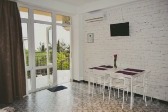 Каждый номер со своим балконом, кухней и санузлом, оборудован всем необходимым для комфортного проживания: двухспальная кровать с ортопедическим матрацом, телевизор, Wi-Fi, шкаф, бойлер, холодильник, микроволновая печь, чайник, электроплита, на кухне вся необходимая посуда. Балконы оснащёны стульями и столиком.
