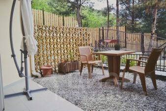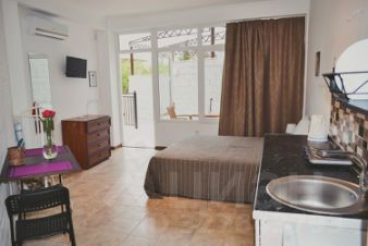 На 1 этаже расположены: 4 однокомнатных апартамента на 2-3 гостя, эти номера со своим отдельным входом и у каждого есть свой патио оборудованным зонтиками и шезлонгами, а также 1 апартамент вместимостью до 4 гостей с видом на море и комната для горничной.
