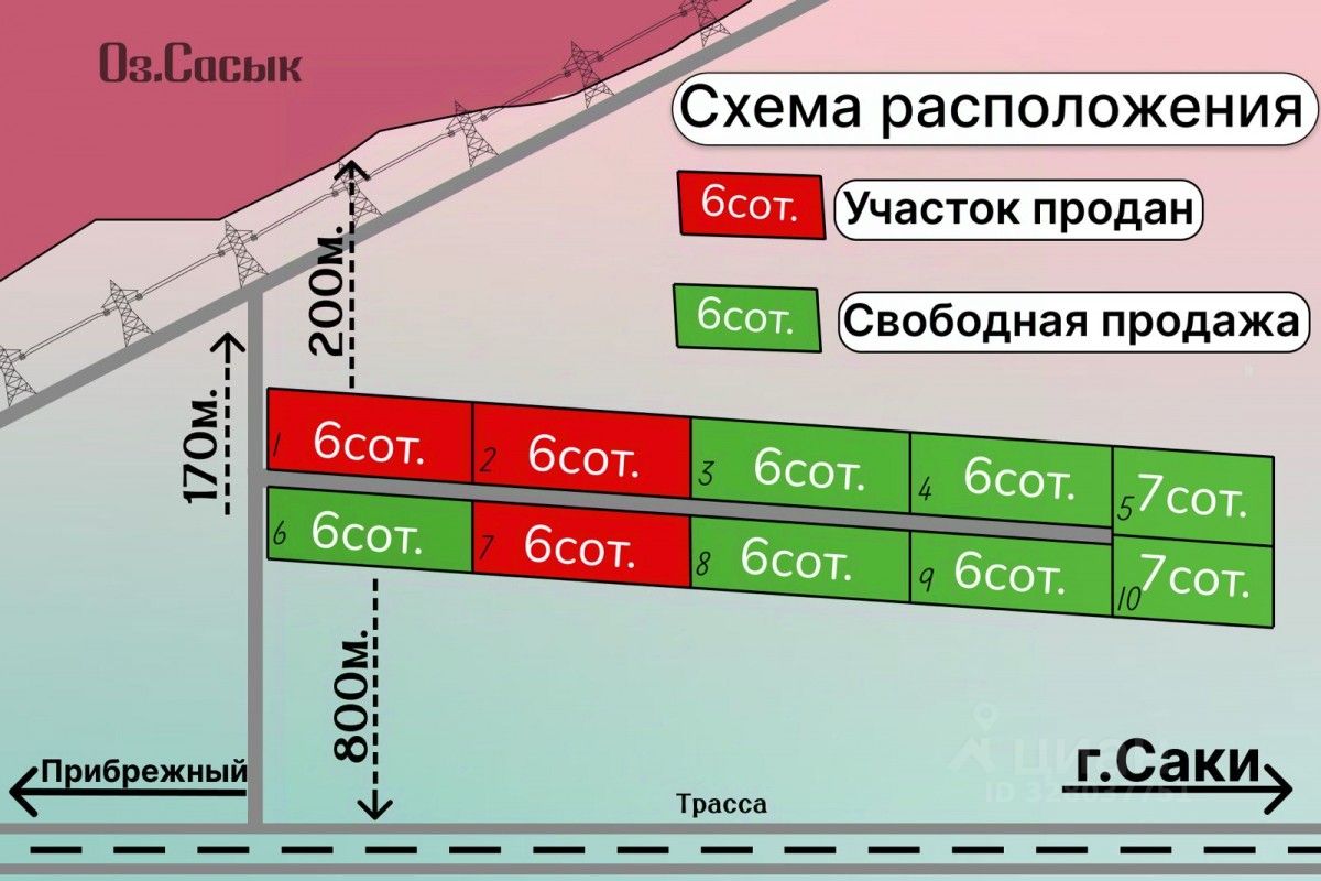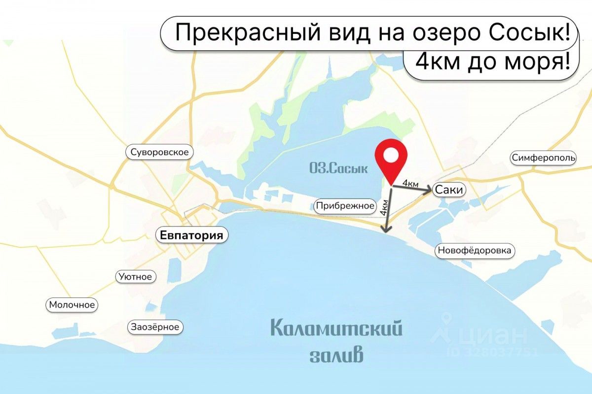 На расстоянии 2 км с. Прибрежное с новым детским садиком и школой, в 15 минутах езды от г. Евпатории и 5 от г. Саки.