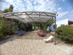 Установлена беседка с живой изгородью из винограда. Навес под две машины.
