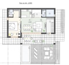 • Первый этаж: крытая парковка на два автомобиля, бассейн с зоной отдыха, кухня гостиная, спальня и два санузла.