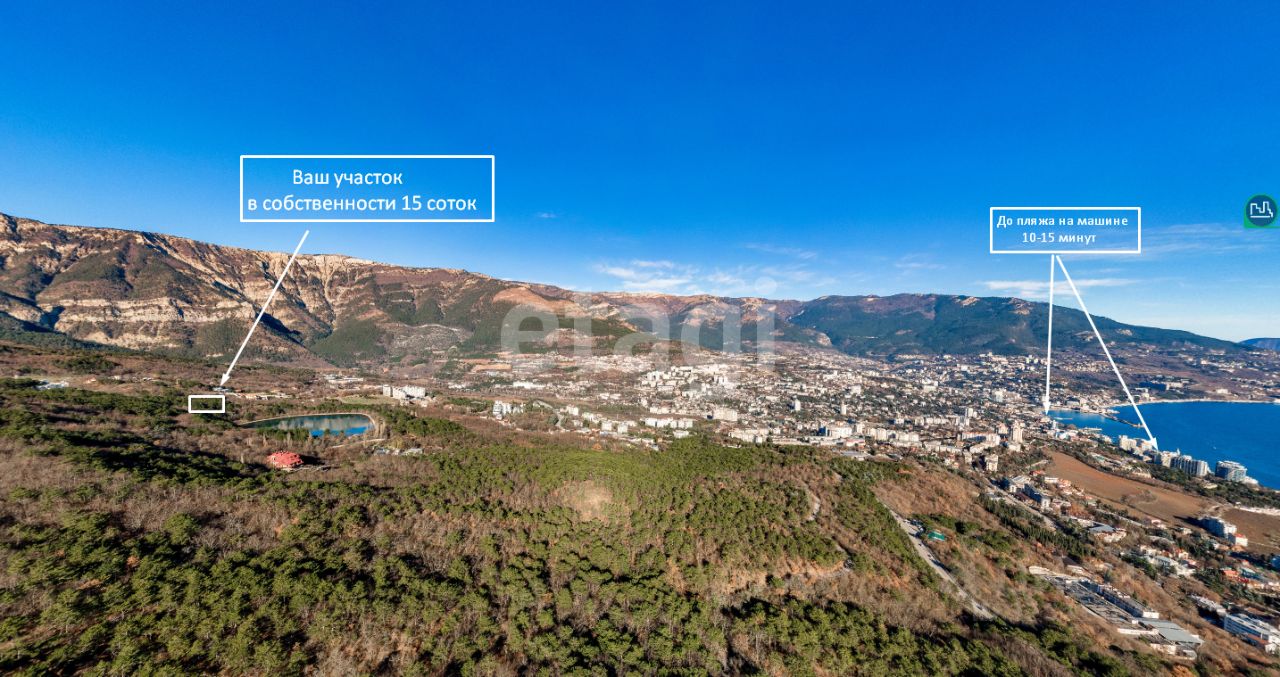 Участок площадью 15 соток в поселке Виноградное расположен на холме в пер. Бахчисарайский, что обеспечивает панорамные видовые характеристики и преимущественную циркуляцию чистого горного воздуха.