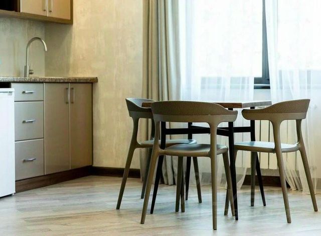 * Кухня с обеденной зоной, оборудованная всем необходимым- индукционная плита, вытяжка, микроволновая печь, холодильник, вся посуда, столовые приборы. Из кухни есть отдельный выход на балкон с установленной выдвижной москитной сеткой.