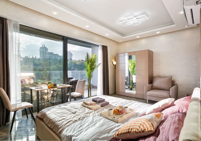 ТОЛЬКО ДО ЛЕТА ДО 1 МАЯ! 50 000р и коммуналка около 7000 и комиссия агенству Апартамент на 17 этаже: Студия +мини спальня (45 м²) с террасой с видом на горы и частично море. До 3 человек (двуспальная кровать и раскладное кресло) Пешком до: 8 минут - пляж. 8 минут - набережная. 10 минут - супермаркет ПУД. 1 минута - ресторан, кофейня, СПА, тренажерный зал и бассейна на крыше. 1 минута - детская площадка. 2 минуты - теннисные корты. Парковка: доступна на территории за шлагбаумом только при наличии мест! паркинг - от 1500 до 3000 руб / сутки. В соседнем доме: СПА — 2500 руб. в день с человека. Тренажерный зал — 600 руб. за 1 посещение (1300р с учётом 1,5 часов СПА) Ресторан (по меню). Бассейн с подогревом на крыше — 1000 руб. с человека. Правила заселения и выселения:- Пожалуйста, предупреждайте о своем приезде заранее, желательно за день до заезда. - Заезд с 14:00 (если приезд раньше - можно оставить вещи, пока идет уборка). - Выезд до 12:00 (возможно продление за дополнительную плату, только если квартира не забронирована следующими гостями). Вместимость апартамента: 4 гостей/ спальные места: в кухне-студии: кровать двуспальная, в спальне: двухъярусная кровать на двоих с полностью укомплектованной кухней кондиционер, утюг, гладильная доска, пылесос. Телевизор (встроенный ТВ ТЮНЕР + WIFI - отличное качество изображения) На террасе- мебель