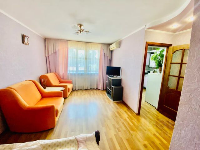 Однокомнатная квартира находится на втором этаже пятиэтажного дома в центре города рядом с овощным рынком в 15-ти мин от набережной и 25-и мин до пляжа пешком.В квартире: Двухспальная кровать + одноместная кровать,кондиционер,интернет Wi-FI. кабельное телевидение, холодильник, газовая колонка (вода круглосуточно),стиральная машинка,утюг, газовая плита,микроволновая печь, чайник, посуда, полотенца, спальное бельё.