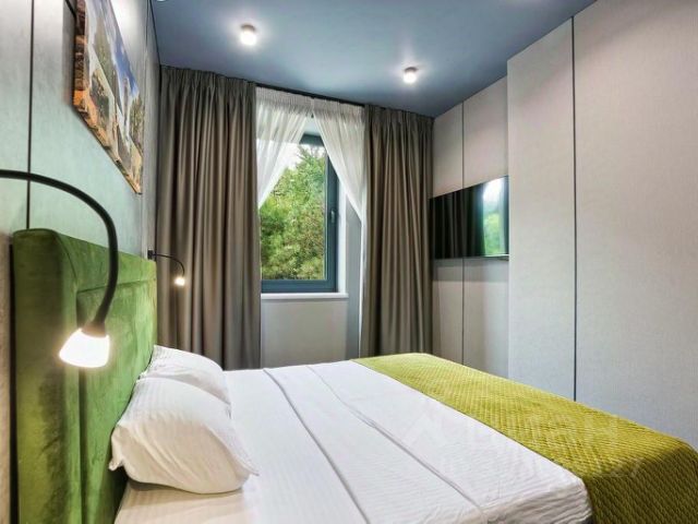 Квартира состоит из зоны прихожей с большим гардеробным шкафом, кухни-гостиной, двух санузлов, большого пространства, разделенного на спальню и зону отдыха.