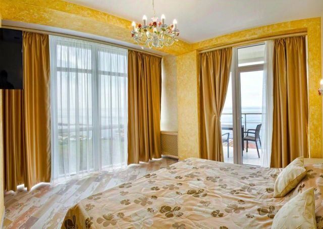Квартира с прекрасным видом на море и горы, общей площадью 130 квадратных метров, расположена на третьем этаже нового жилищного комплекса, в пригороде Ялты, пгт. Восход. Выполнен дизайнерский ремонт, панорамное остекление, есть вся необходимая бытовая техника, мебель и посуда, кондиционеры, индивидуальное отопление.