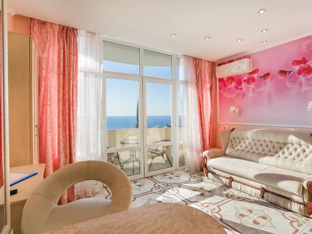 Кухня -студио, два раскладных дивана, санузел с душевой кабинкой, стиральная машинка, шкаф-купе, ТВ и Wi-Fi, посуда, электрочайник, 2-х комфорочная плита, холодидьник, посуда, кондиционер, постель, полотенце, утюг, фен, застекленный балкон с видом на море.