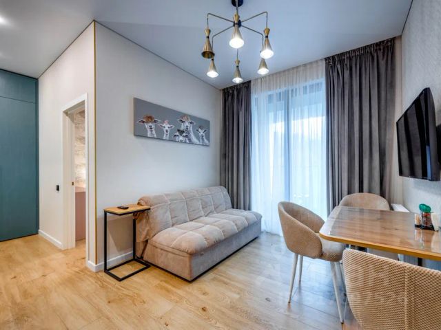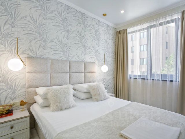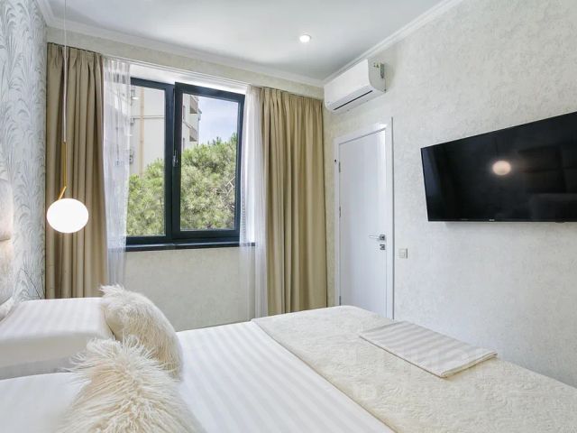 Апартаменты общей площадью 90 квадратных метров, из которых 23 квадратных метра - полностью оборудованный балкон для отдыха, кушетка, два кресла, столики, большой обеденный стол со стульями на шестерых человек. В квартире гостиная и спальня, оборудованные плазменными экранами. Два санузла, душ, гардеробная. Кондиционирование, телевидение, Wi-Fi. Стиральная машина, посудомоечная машина, холодильник, плита, духовая печь Bosh. По желанию за дополнительную плату можно заказать уборку апартаментов ежедневно.