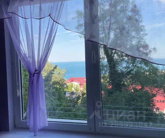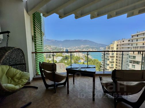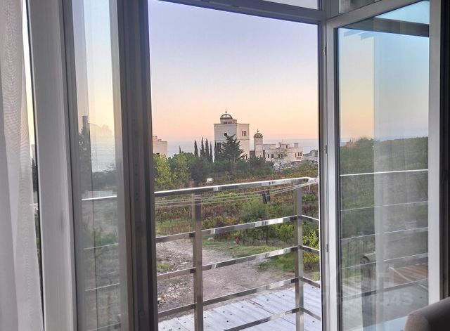 Окна и балкон-терраса (авторское решение архитектора - 20 метров длиной) выходят на море, парк санатория Крым и подножие Медведь-горы (АЮ-ДАГ).