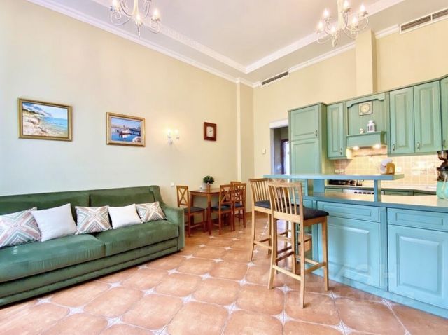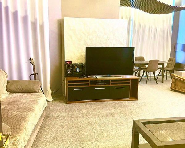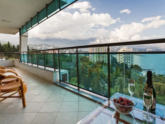 Дом находится в тихой парковой зоне на набережной Ялты, заезд к дому и в охраняемую парковую зону — по пропускному режиму. Общая площадь квартиры 76 кв. метров + 10 метров балкон. 5 спальных мест. Спальня с большой двухспальной кроватью (ширина кровати 180 см). В зале большой раскладной диван с 2-мя спальными местами (ширина спального места 160 см). Есть дополнительно односпальная евро-раскладушка. Зал объединён с кухней. Балкон меблирован мебелью: столик со стульями, шезлонг. Во всех комнатах кондиционеры, плазменный большой телевизор. Два санузла (в одном — ванная, во втором — душевая кабина). В санузлах тёплые полы. Стиральная машина LG с сушкой. На кухне — холодильник, посудомоечная, духовой шкаф, стеклокерамическая варочная панель, микроволновая печь, чайник, посуда. Жильцам предлагается: постельное бельё, подушки, одеяла, полотенца, утюг, гладильная доска. Вид из квартиры — на тихую сторону, на парк и над кронами деревьев вид на море. В доме — круглосуточная охрана, консьерж, камеры видеонаблюдения, собственная инженерная служба. Парковка бесплатная около дома на собственной территории, заезд через охраняемый КПП. При желании — в доме есть многоуровневая подземная охраняемая парковка (300 руб./сутки). Рядом с домом оборудованная парковая зона, три оборудованных пляжа, несколько ресторанов, детское кафе, столовая, три детских уличных площадки, детский развивающий центр, детская игровая комната, теннисные корты, мини-футбольный детский клуб, продуктовые магазины, салон красоты, аквапарк "Атлантида", водолечебница, кювет с питьевой минеральной водой, два спа-комплекса с банями, саунами, соляной комнатой и бассейнами.