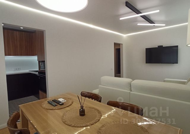В гостиной - большой белый мягкий диван MOON с антивандальной обивкой из микровелюра. Раскладывается в спальное место 150*210. Большой деревянный обеденный стол SKDESIGN 150*75 см на 6 человек, сплит-система.