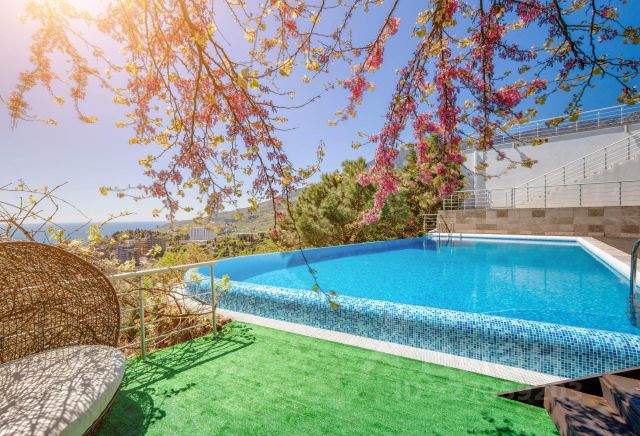 Сдается дом с бассейном у моря, расположенный в пригороде ялты, в курортном поселке Отрадное. Поблизости с домом расположен широко известный гостиничный комплекс Ялта Интурист и Никитский ботанический сад. сдается только с июня по август - торг уместен! в зависимости от количества людей и срока проживания от 14 суток На большом благоустроенном участке (18 соток) расположены: +Основной 3-этажный дом; +Гостевой 2-этажный дом; +Бассейн с зоной для загара; Беседка и места для отдыха; +Зона BBQ. Ключевыми преимуществами дома являются - большая благоустроенная территория, удачное расположение и полная готовность дома к проживанию. В доме выполнена качественная отделка, а также он полностью обустроен мебелью и техникой для комфортной жизни круглый год. Вокруг дома раскинулся великолепный сад с субтропической растительностью. На участке растут как фруктовые, так и декоративные деревья, а также множество цветов и кустарников. Сам дом скрыт от посторонних глаз густыми кронами вековых дубов. Планировка основного дома. На 1 этаже: +прихожая, +просторная кухня-столовая с выходом на террасу, + гостевая спальня-кабинет. + сауна, + совмещенный санузел, +винный погреб. На 2 этаже: + большая гостиная с действующим камином и выходом на террасу, + две спальни, каждая с индивидуальным санузлом с ванной На 3 этаже: + просторный холл, + два санузла с ваннами, + три спальни, каждая с выходом на балкон, + балконы обустроенные мебелью для отдыха. Планировка гостевого дома. На 1 этаже: +гараж для автомобиля. На 2 этаже: + две полноценные 1-комнатные квартиры, каждая с кухней, спальней и санузлом. В нескольких минутах ходьбы от дома находятся: + пляжи и набережная, +бюветы с минеральной водой, + парк с прогулочными зонами 14 Га, + лечебные корпуса с уникальными методиками грязелечения. В 10 минутах езды на автомобиле находятся: Массандровский парк, гостиница Ялта Интурист, рестораны Чайка на пляже и Апельсин, а также Никитский ботанический сад. До Ялты можно добраться за 15 минут на авто.