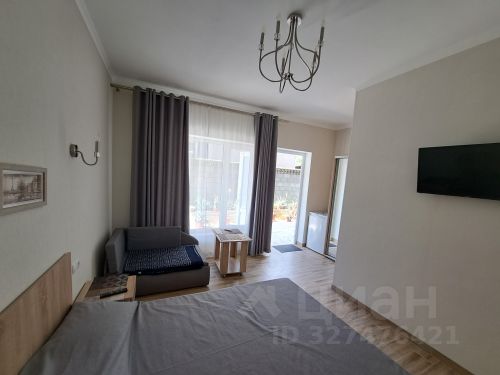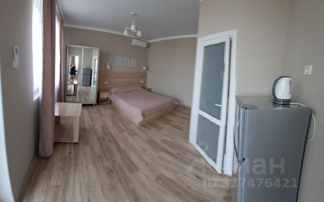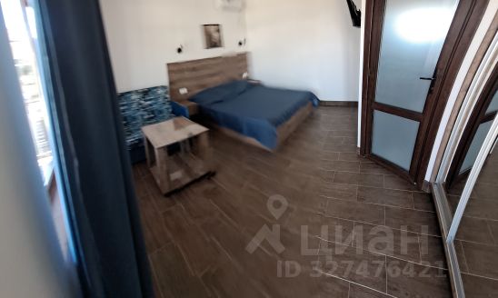 В комнате 2 двуспальные кровати, кожаная мягкая мебель с раскладным диваном, кондиционер, два шкафа/гардероба с зеркалами, трюмо с зеркалом, пуфик, большой холодильник, телевизор, выход на лоджию с видом на море, горы и Генуэзскую крепость.