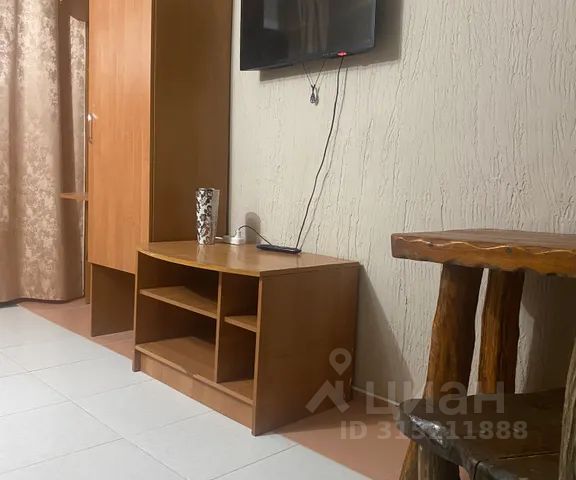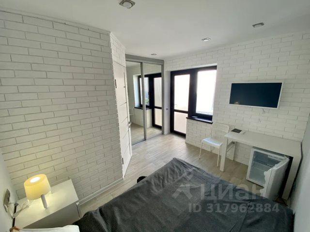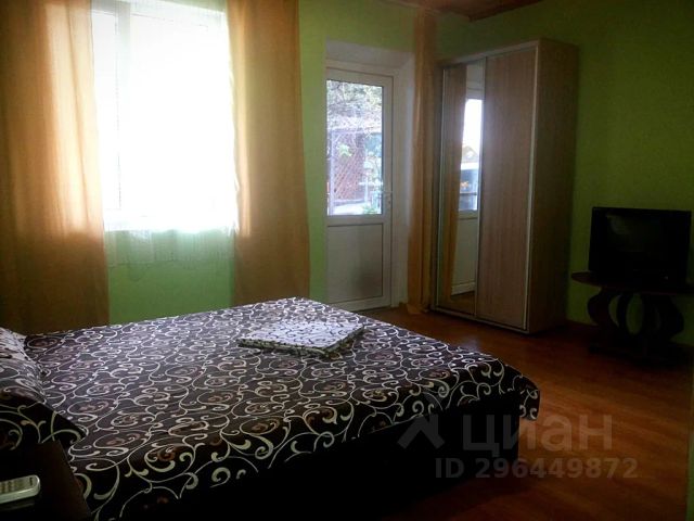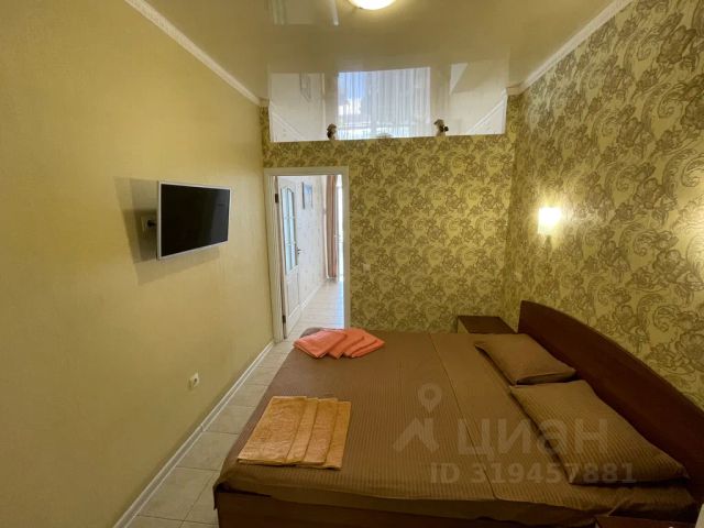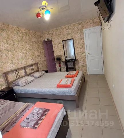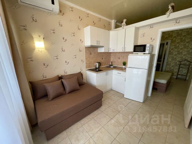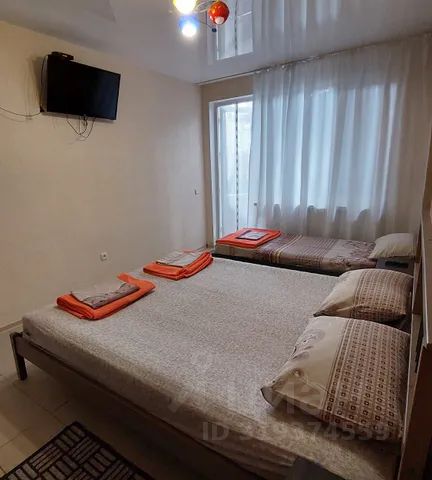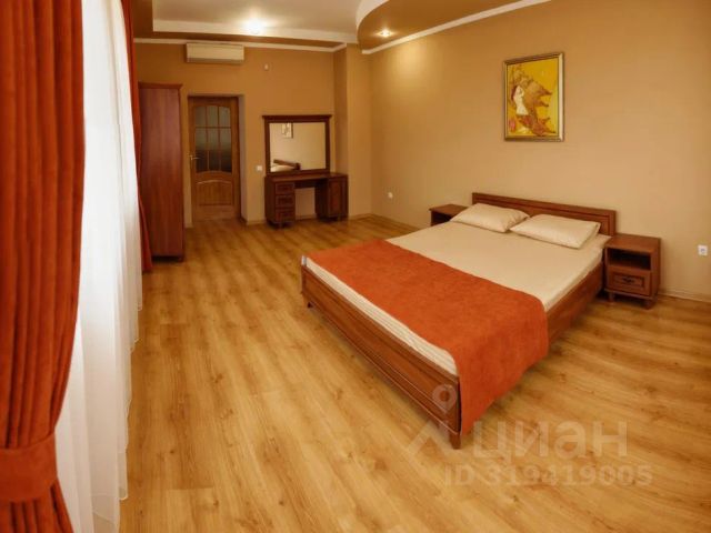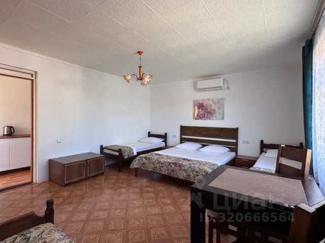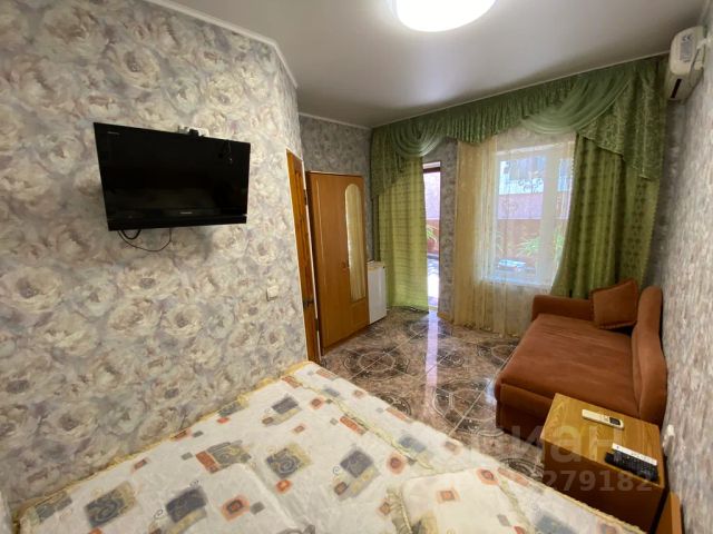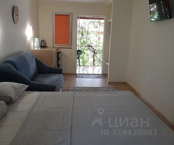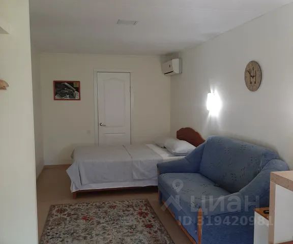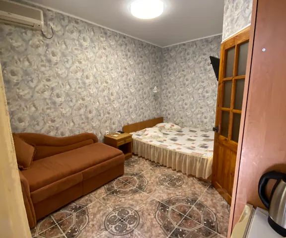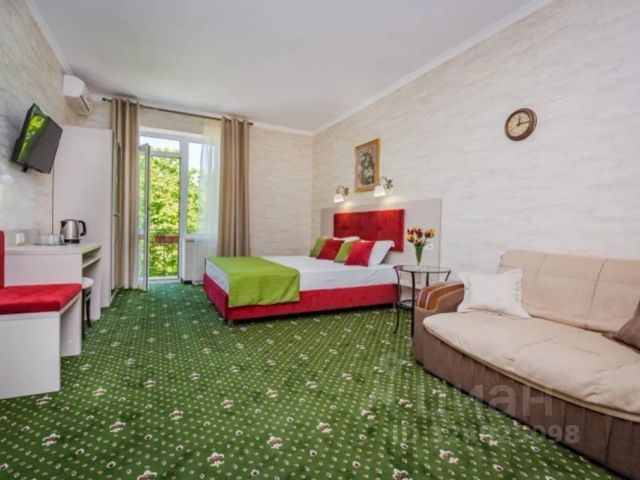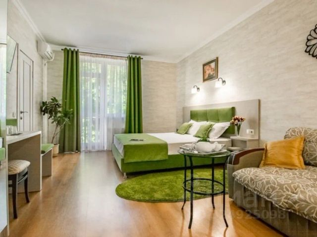 В комнате 2 двуспальные кровати, кожаная мягкая мебель с раскладным диваном, кондиционер, два шкафа/гардероба с зеркалами, трюмо с зеркалом, пуфик, большой холодильник, телевизор, выход на лоджию с видом на море, горы и Генуэзскую крепость.