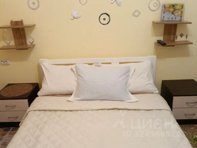 В комнате 2 двуспальные кровати, кожаная мягкая мебель с раскладным диваном, кондиционер, два шкафа/гардероба с зеркалами, трюмо с зеркалом, пуфик, большой холодильник, телевизор, выход на лоджию с видом на море, горы и Генуэзскую крепость.