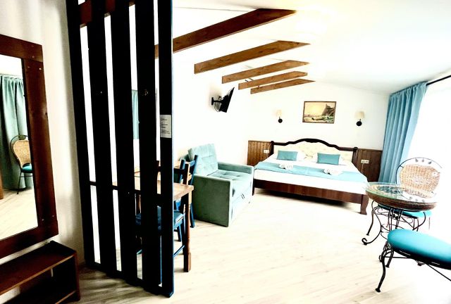 Отель Акрополь - это место для отдыха или командировки на берегу моря. Расположенный всего в нескольких минутах ходьбы от пляжа, он предлагает уютные номера с балконами, откуда открывается прекрасный вид на море. Отель состоит из двух этажей, на которых расположены комфортабельные номера с современными удобствами, такими как кондиционер, телевизор и бесплатный Wi-Fi, парковка. Кроме того, отель предоставляет гостям возможность пользоваться общей кухней и зоной отдыха, где можно провести время с друзьями или семьей. Помимо знаменитого Золотого пляжа, также можно посетить местные достопримечательности: Затонувший корабль Кара-кермен, Музей Веры Мухиной и Дача Стамболи. Расстояние до железнодорожного вокзала 1,8 км. Просторный и светлый двухкомнатный номер с балконом, который может вместить до 5 человек. В номере расположена большая двуспальная кровать, раскладной двуспальный диван и односпальный диванчик, что делает его идеальным для семейного отдыха или групповой поездки. Номер оборудован кондиционером, санузлом с душевой кабиной, телевизором, холодильником, феном, электрочайником.