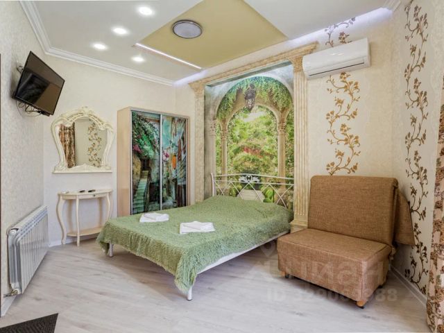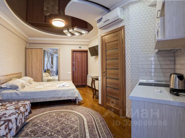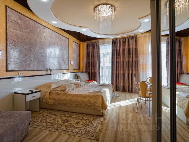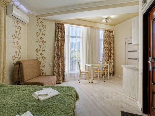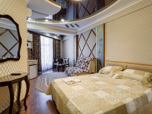 Просторный светлый номер с высокими потолками 3,5 м и большими панорамными окнами.