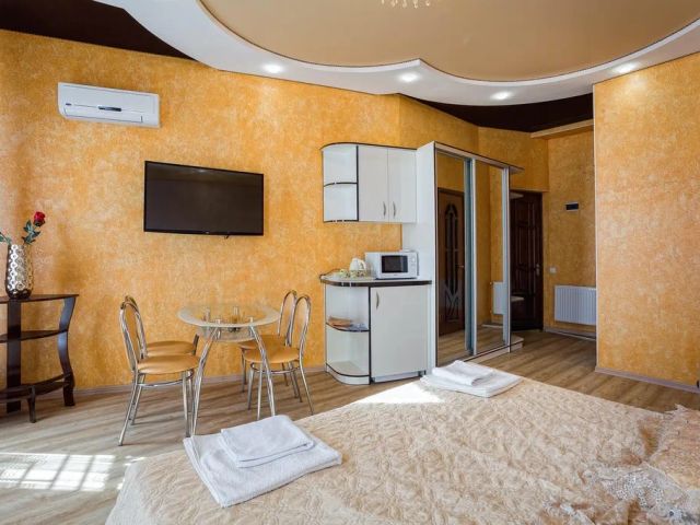 * А также кондиционером, холодильником, телевизором, электрочайником, микроволновой печью, феном и сушилкой для белья. Есть набор посуды и приборов, чайные и банные принадлежности.