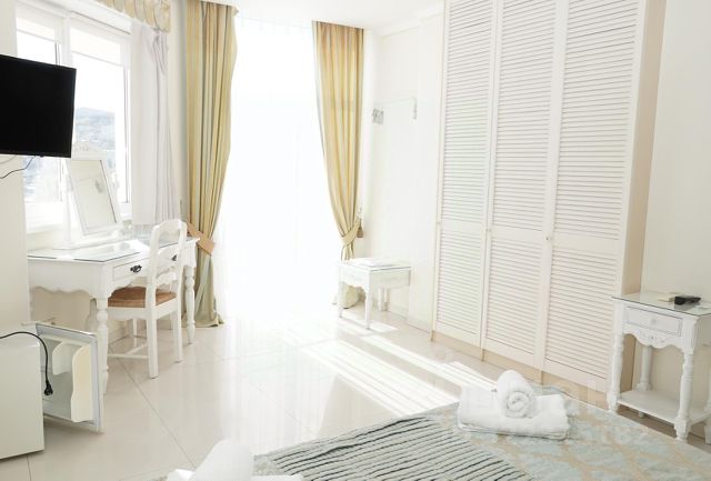 Номер содержит двуспальную кровать с прикроватными тумбочками, раскладной диван, обеденный стол, 3 стула, шкаф, шкафчик для посуды и чайный столик, большое зеркало, фен, холодильник, мини-сейф, телевизор ЖК 32 дюйма (цифровое телевидение 40 каналов), кондиционер, отопление, электрочайник, столовая посуда, холодная и горячая вода без перебоев, санузел, укомплектованный душевой кабиной, раковиной, унитазом, биде, отдельный балкон со столиком и стульями.