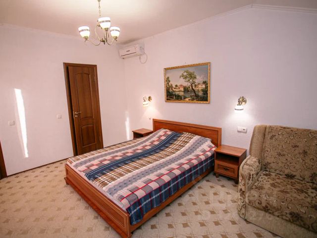 Трёхместный номер расположен на 2 этаже. Номер оборудован новой современной мебелью, телевизором, кондиционером, есть санузел и душ. Горячая и холодная вода круглосуточно. Выход из номера на террасу, оборудованную столиком и сушилкой для белья. В стоимость номера входит постельное бельё, полотенца и интернет. На этаже общая кухня, оборудованная всем необходимым. Дети до 3 лет, без предоставления дополнительного места, бесплатно. В номере есть двуспальная кровать, диванчик, прикроватные тумбочки, журнальный столик и зеркальный шкаф. Гостевой дом расположен в 100 метрах от пляжа. Рядом в шаговой доступности вся необходимая инфраструктура - рынок, магазины, аптека, семейная амбулатория, парк аттракционов и автобусная остановка. До центра феодосии 15 минут на маршрутке, до дельфинария - 7 минут пешком.