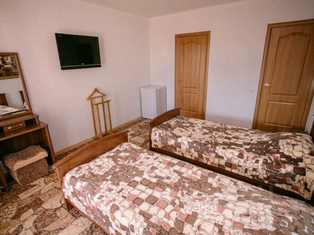 Трехместный номер с отоплением и со всеми удобствами. Отель находится в 50 метрах от моря, шикарный вид из окна. Мы гарантируем Вам чистоту и комфорт. Также имеется вся отчетная документация для командировочных гостей. Есть стоянка для авто во дворе. Для вашего удобства имеются чайники и микроволновки. Рядом с нами работают несколько продуктовых магазинов, в том числе и круглосуточные. В 100 метрах есть столовая с большим разнообразием блюд.