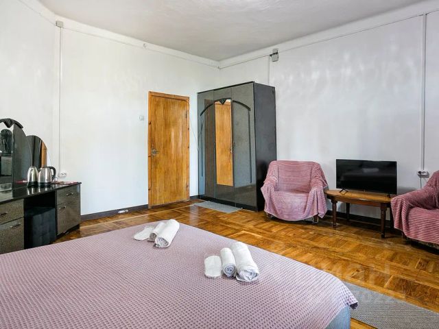 Номер в классическом стиле. В номере есть: wi-fi, дополнительное место — кровать, кресло-кровать или диван, телевизор с плоским экраном, кондиционер, халат, фен, тапочки, косметический набор для душа, холодильник, мини-бар, пляжные полотенца, чайник, чайный набор.