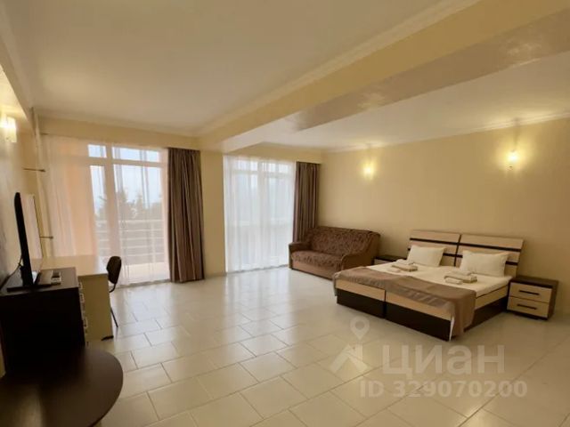 Просторный светлый номер с высокими потолками 3,5 м и большими панорамными окнами.