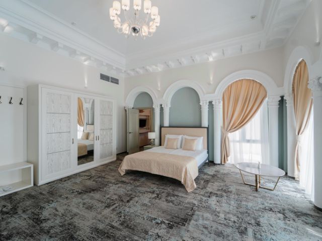 Большой трехкомнатный номер на вилле 19 века Лимене на территории парк отеля Голубой залив. Здесь комфортно разместятся до 4х гостей. Две спальни. В первой большая ортопедическая кровать KingSize и туалетный столик с пуфами, во второй две односпальные кровати. Гостиная комната с комфортным диваном, зоной отдыха, гардеробом. Санузел просторный с ванной и душем. Номера этой категории расположены на втором этаже здания на южной стороне. Из окон открывается вид на парк отеля, бассейн.