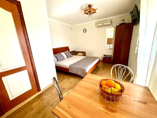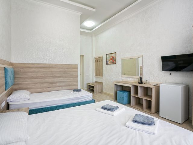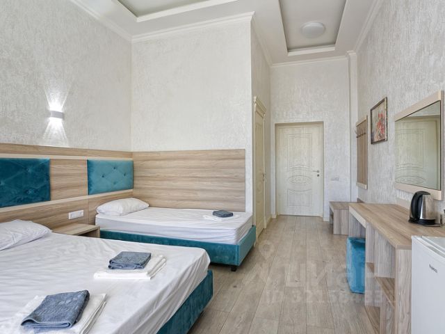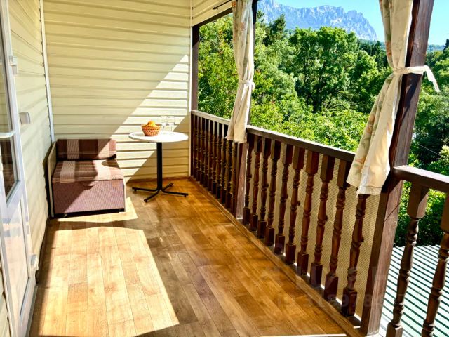 Номер на 2м этаже двухэтажного дома, со всеми удобствами. На территории большого общего двора. Без соседей через стенку и сверху, в отдалении от шумных кафе, для тех, кто хочет спокойно спать ночью. Есть балкон, где можно посидеть, покушать, сушилка для вещей, можно курить. С балкона вид на посёлок и море. Для сна двуспальная кровать 140х200см и диван-кровать 90х200см. Для комфорта шторы блэкаут. На кухне есть всё необходимое для приготовления еды: газовая плита (эл.поджиг, газ-контроль), вытяжка, СВЧ, вся посуда и столовые приборы. Есть фен, утюг. Кондиционер, ТВ smart, WiFi. Есть прикроватный столик для ноутбука.